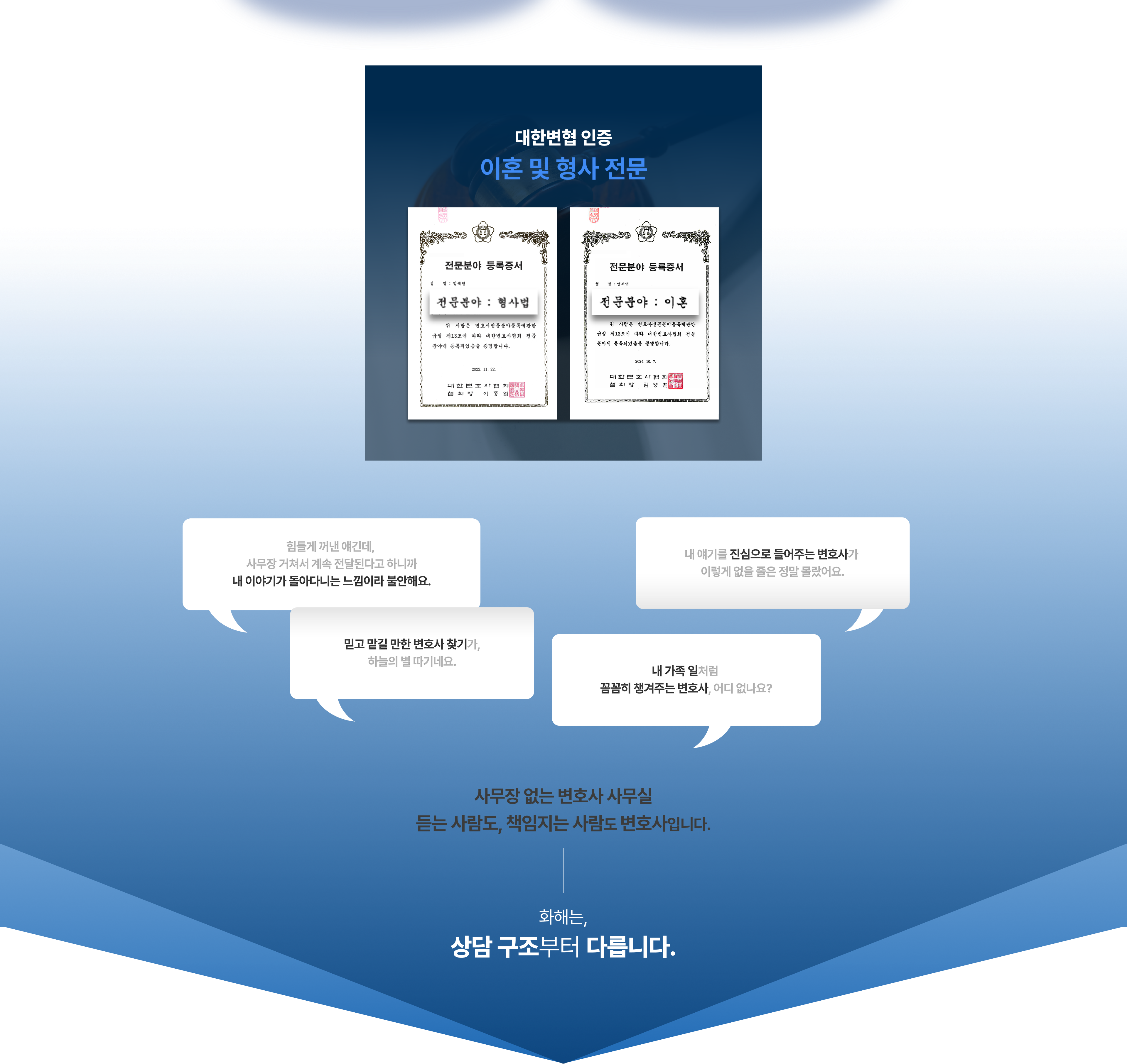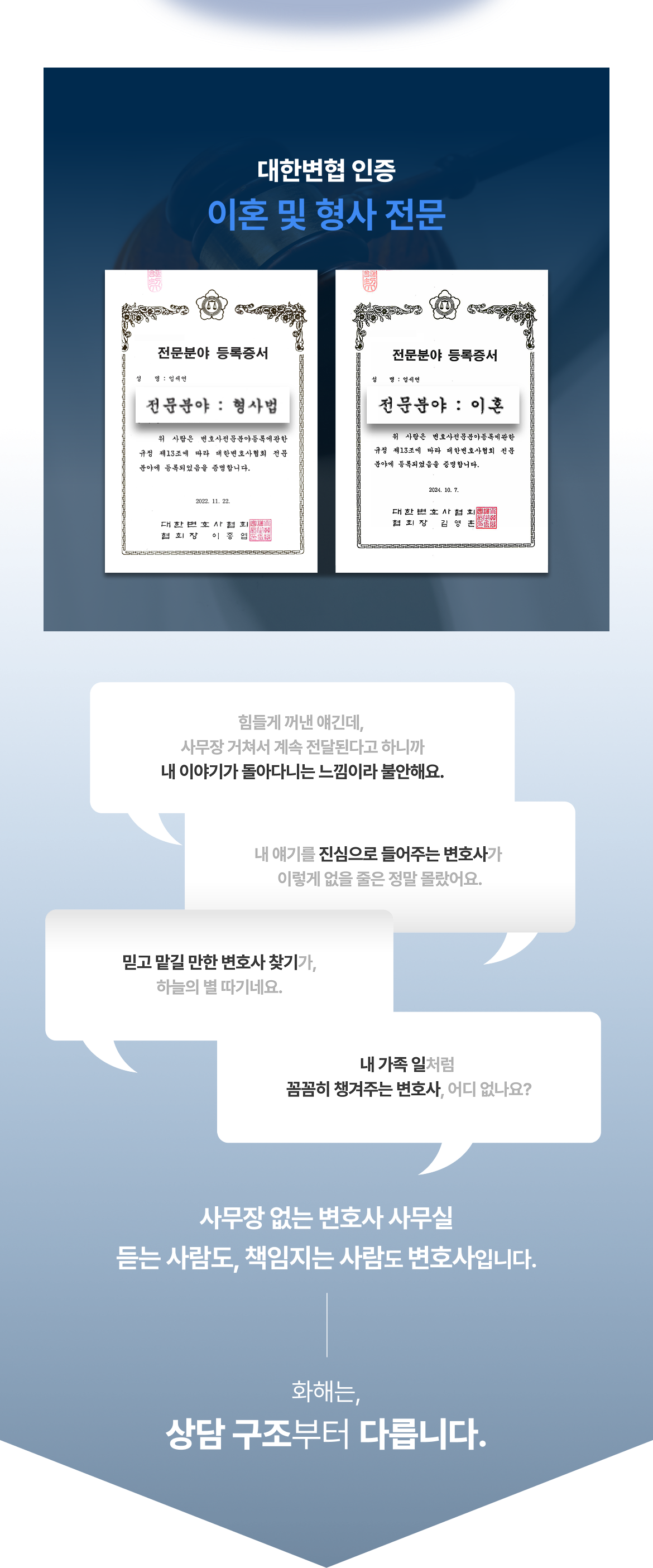 이혼 문제로 머리가 너무 복잡했는데, 처음 상담부터 제 상황을 차분히 정리해주셔서 방향이 잡혔어요. 감정적으로 흔들릴 때마다 현실적인 조언을 해주셔서 큰 도움이 됐습니다.